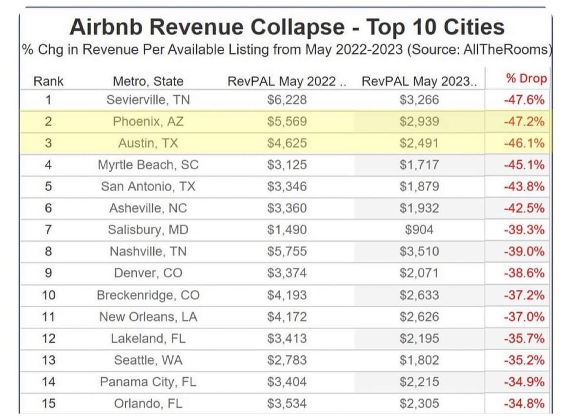 And here are some other cities in the US where AIRBNB or STR has declined significantly over the last year.